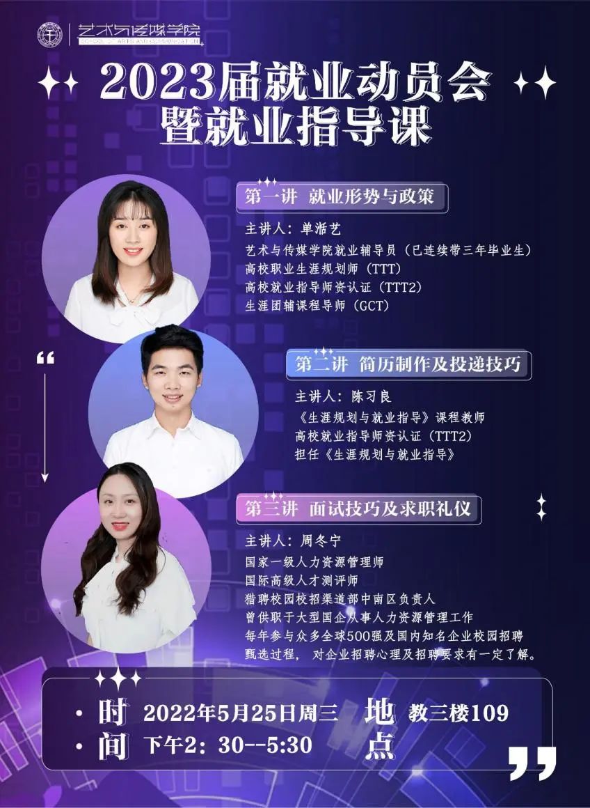为全面贯彻《中国地质大学(武汉)关于进一步加强学生就业工作的通知》的文件精神,深入落实学生就业工作专题推进会上的安排部署,紧紧围绕立德树人根本任务,促进2023届毕业生更加充分更高质量就业,恒峰国际g22在线登录积极实施毕业生就业促进行动。5月25日下午,艺术与传媒学院23届就业动员会暨就业指导课在南望山校区教三楼109教室举行。本次就业指导课以线上和线下的方式相结合,课程内容分为就业形势与政策、简历制作及投递技巧、面试技巧及求职礼仪三个部分。